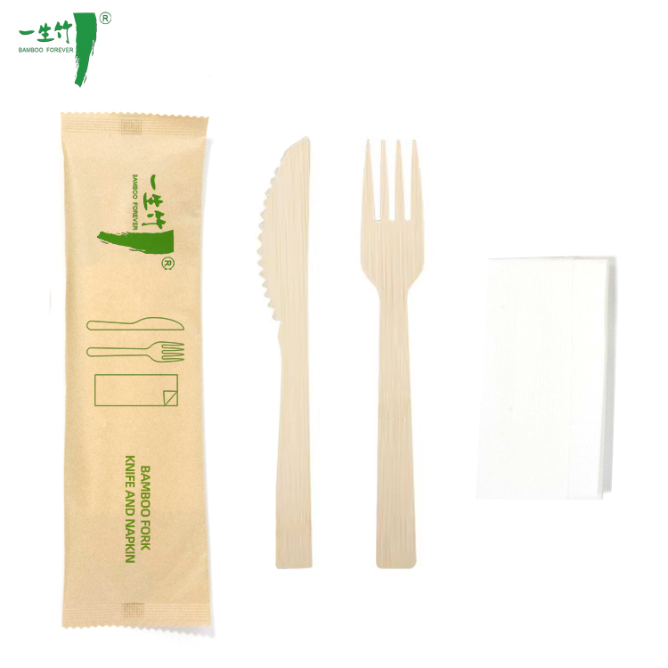 Conjunto Descartável de Talheres de Bambu e Guardanapo Embrulhado em Papel